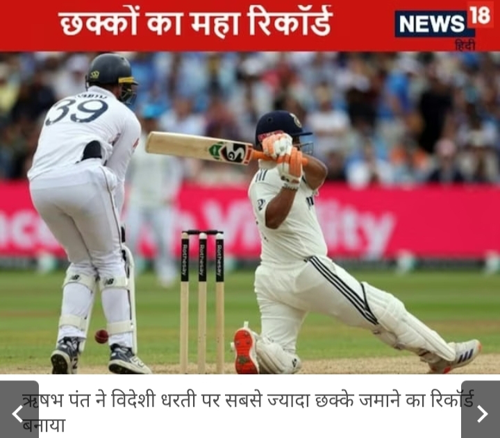 भारतीय विकेट की पर-बल्लेबाज़ ऋषभ पंत ने इंग्लैंड की धरती पर एक ऐतिहासिक उपलब्धि अपने नाम कर ली है। उन्होंने टेस्ट मैचों में इंग्लैंड में खेलते हुए कुल 24 छक्के जड़कर एक नया रिकॉर्ड बना दिया है। यह किसी भी देश के खिलाड़ी द्वारा इंग्लैंड में टेस्ट क्रिकेट में लगाए गए सबसे ज़्यादा छक्के हैं।